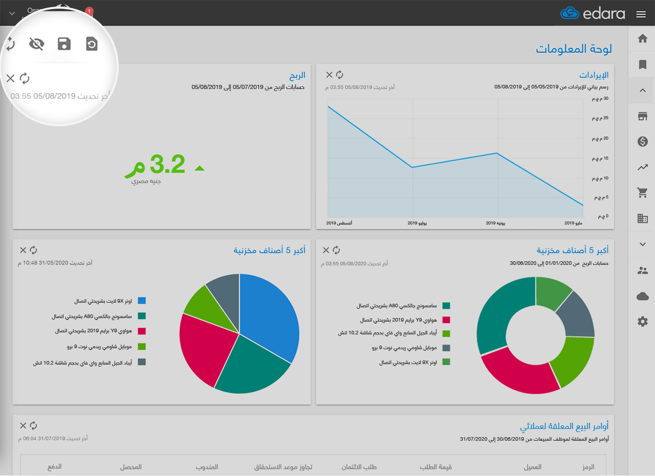 تابع كافة البيانات والمعلومات وقت حدوثها الفعلي وحدّد أرباحك، وأكبر عملاءك، ومنتجاتك الأكثر مبيعًا. تظهر جميع هذه المعلومات في لوحة تفاعلية صُممت خصيصًا لإظهار إحصائيات ومعلومات محدّثة على مدار الساعة.