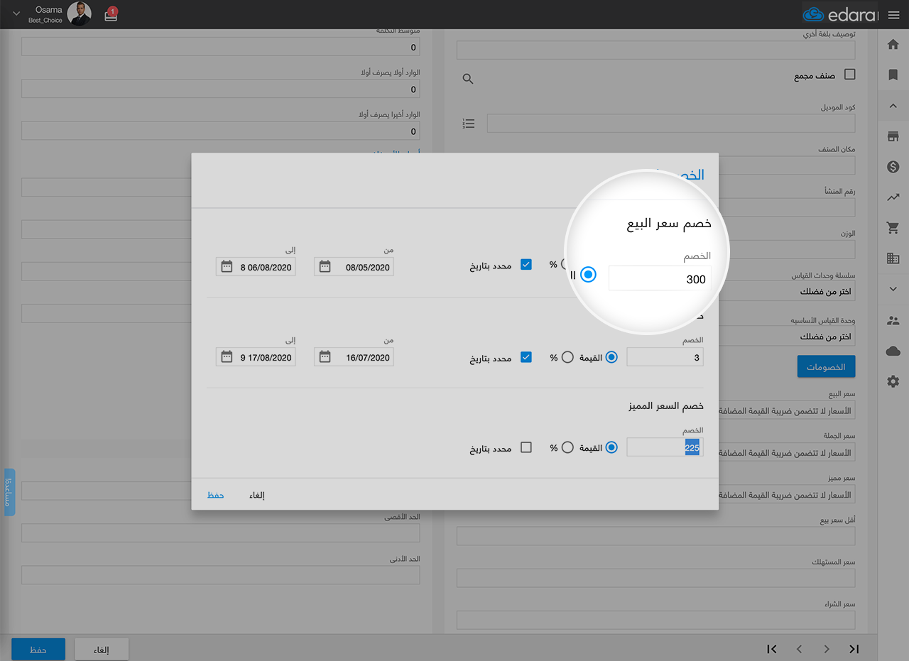 يسمح لك "إدارة" بتحديد أسعار الأصناف لعملائك باختلاف مستوياتهم "مستهلك نهائي، تاجر، تاجر مميز"، كما يمكّنك من تحديد حدود الأسعار وسواء كانت التخفيضات تطبق على صنف بعينه أو على الفاتورة ككل، ويمكّنك أيضًا من إرسال أوامر المبيعات في رسائل نصية لعملائك.